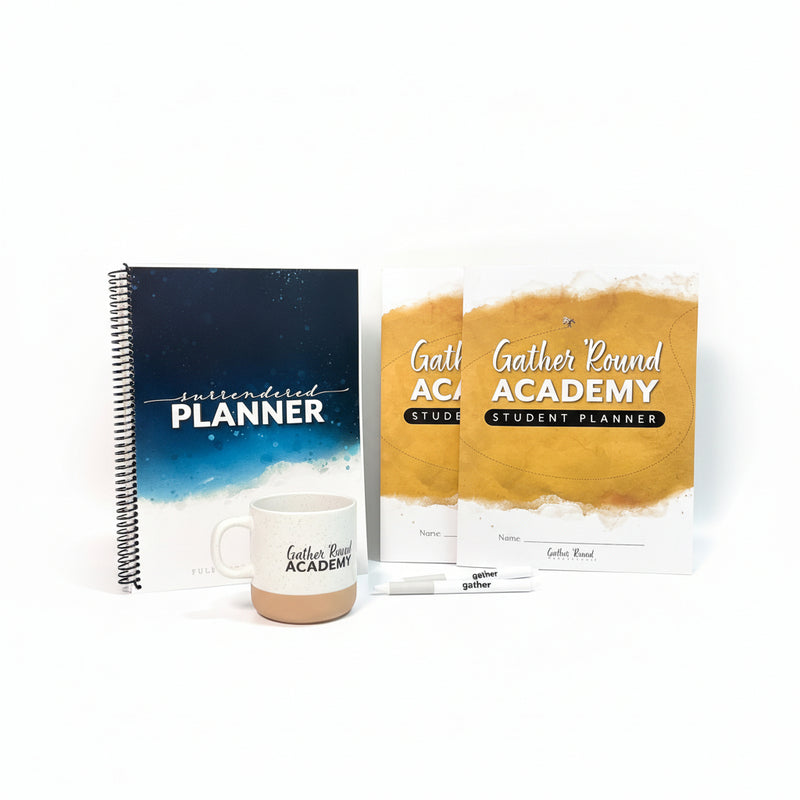 At the heart of this special pack is something just for mom and something for each student. Moms will receive a beautiful Gather ’Round mug along with our brand new Surrendered Planner, a six-month planner created to help you organize your days while keeping your heart centered on the Lord. With space for meal planning, activities, priorities, and 30-minute time blocking, this planner brings structure and flexibility together beautifully. Each day begins with the reminder “. . . if the Lord wills,” helping you surrender your plans so God can establish your steps.