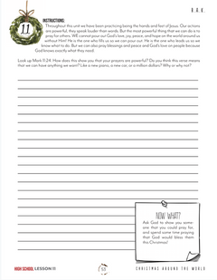 - High School: Designed for 15-18 year olds—requires full page and essay responses, research, and personal reflection and application.