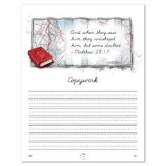 - Practice includes: Scripture verse tracing, copywork, dictation, and spelling words